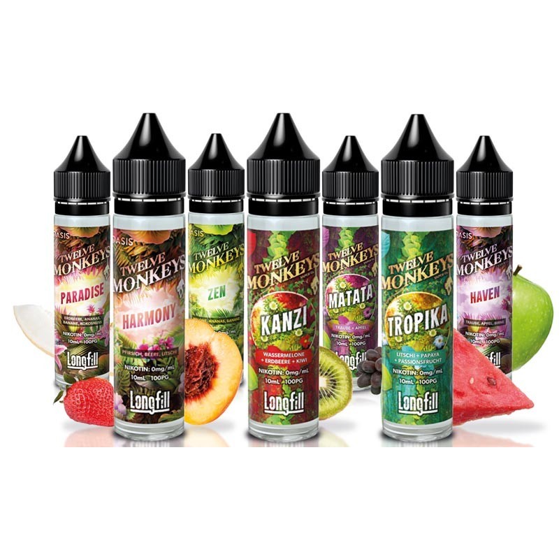 In dieser Aroma Serie von den bekannten 12 Affen(Twelve Monkeys) ist für jeden der passende Geschmack dabei. Allesamt fruchtig und saftig, das sind die richtigen Aromen für alle Feinschmecker. Du musst die Flasche nur mit deiner Base und ggf. Niktoinshots auffüllen, gut schütteln und dein Liquid ist fertig. Aromen schmecken teilweise nach einigen Tagen Reifezeit etwas besser. Probiere es einfach mal aus!