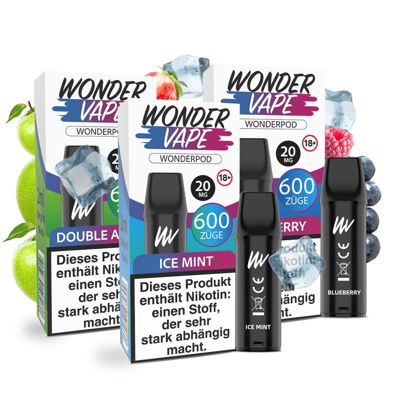 Die Wonderpod von der Marke Wondervape sind vorbefüllte Liquid Pods, erhältlich in 10 leckeren Geschmacksrichtungen, mit 20mg/ml (2%) Nikotin und passen auch in den Elfa Akku. Die Wondervape Pods enthalten 2ml Liquid für bis zu 600 Züge.